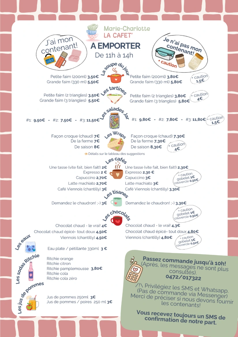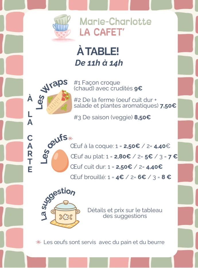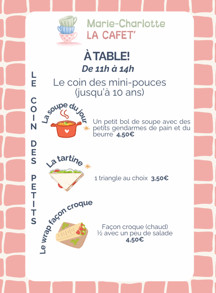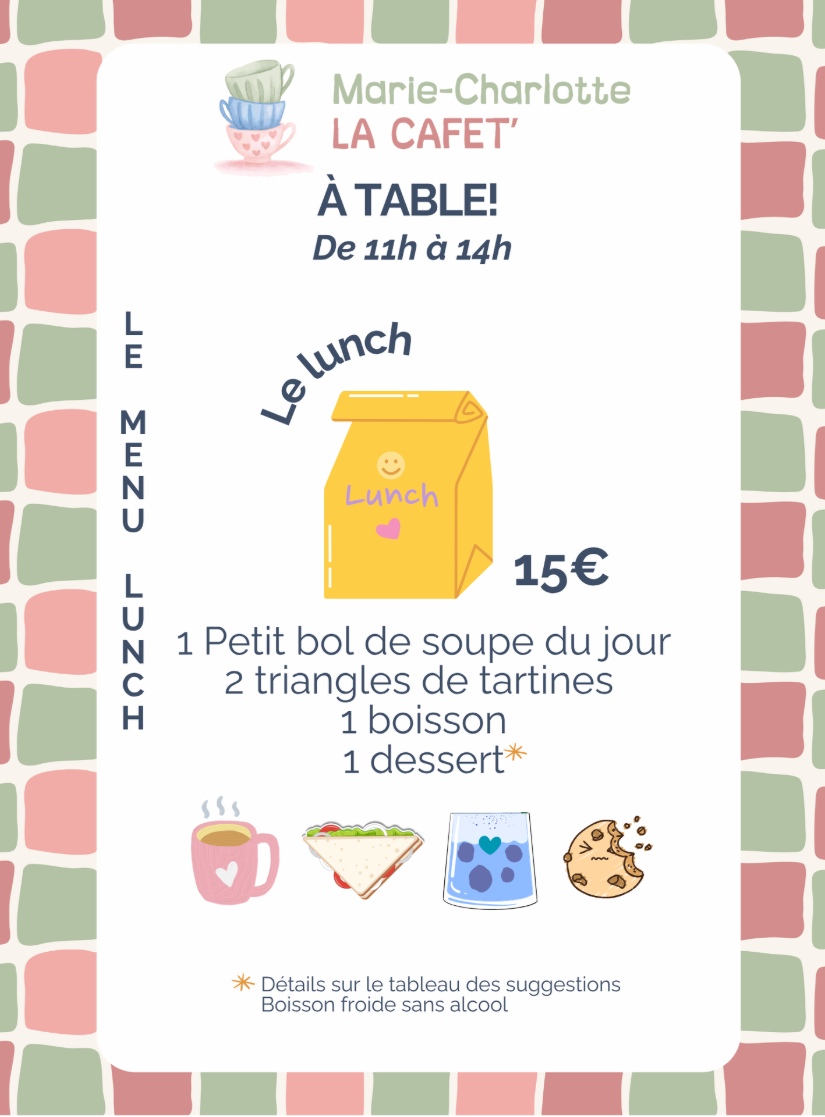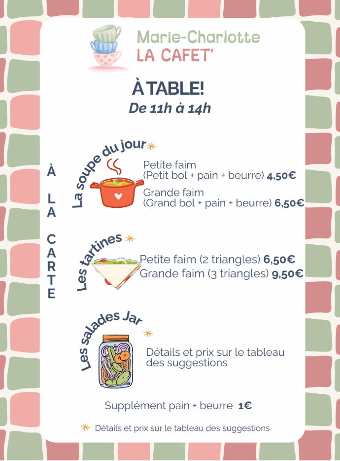 - Une petite restauration simple (tartines, soupe, wrap, salades), rapide, et saine, à consommer sur place ou à emporter.