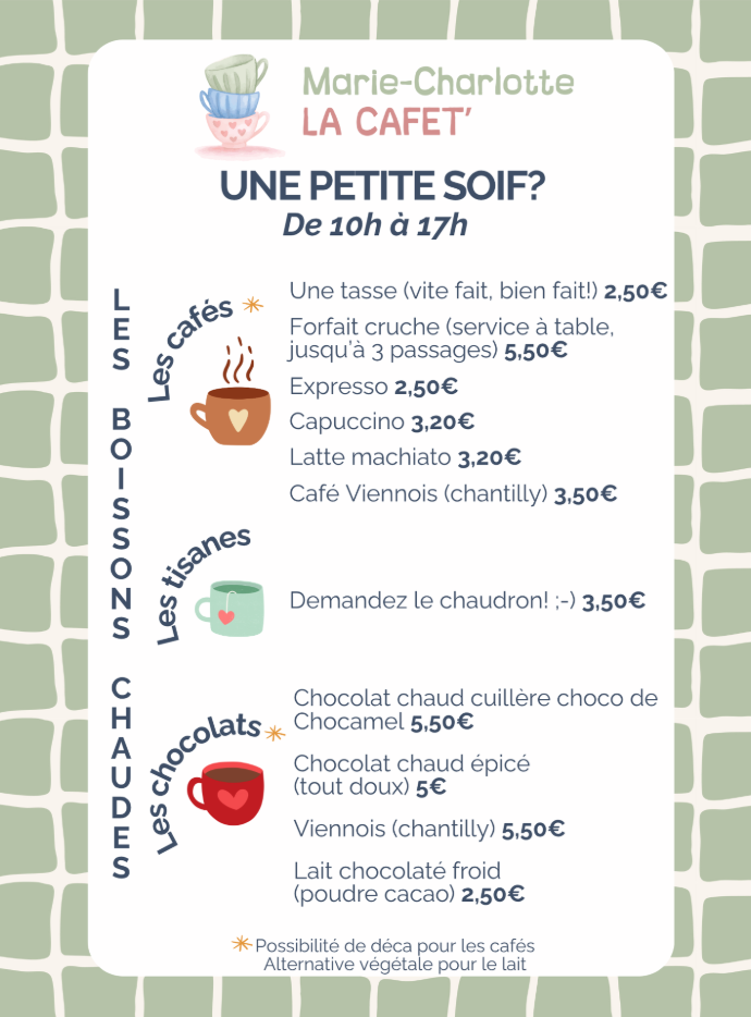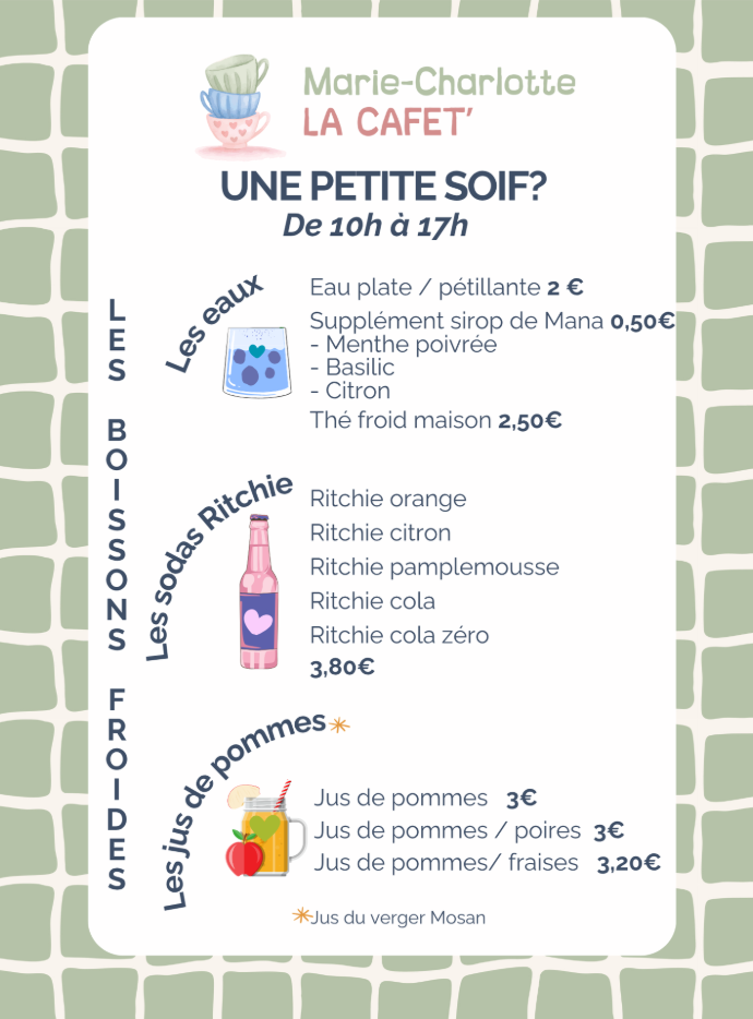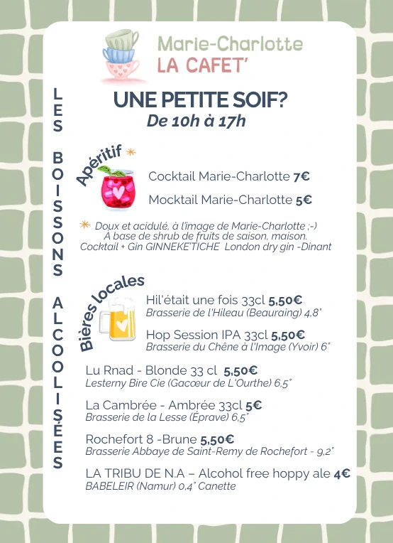 - Une carte de boissons fraîches (softs, bières spéciales) ou chaudes (tisanes, café, chocolat chaud), avec ou sans alcool pour vous détendre ou vous réchauffer le cœur.