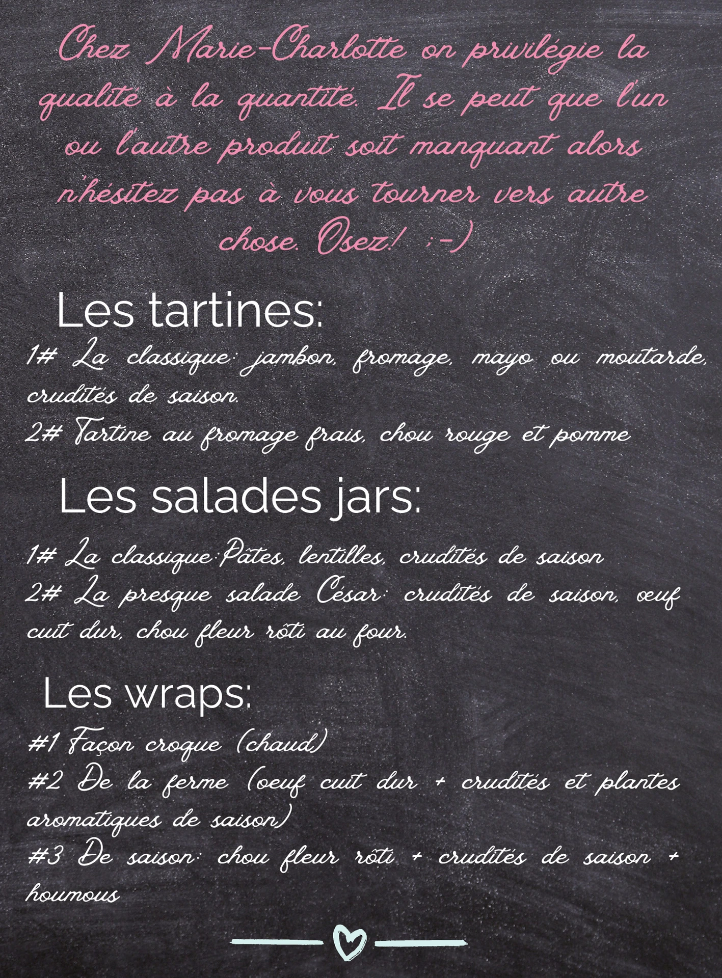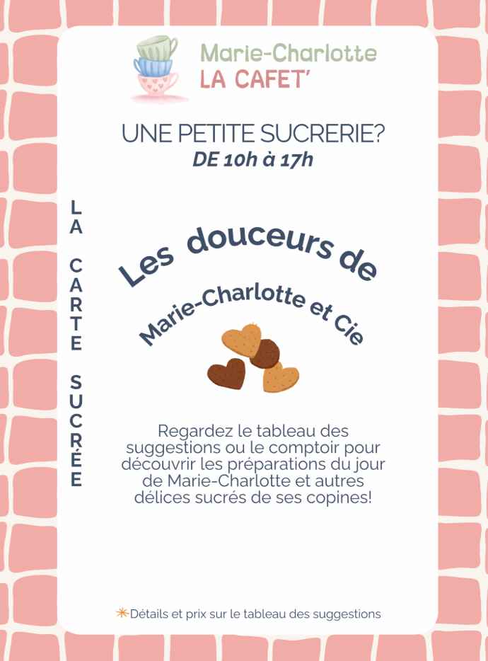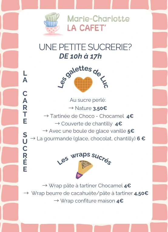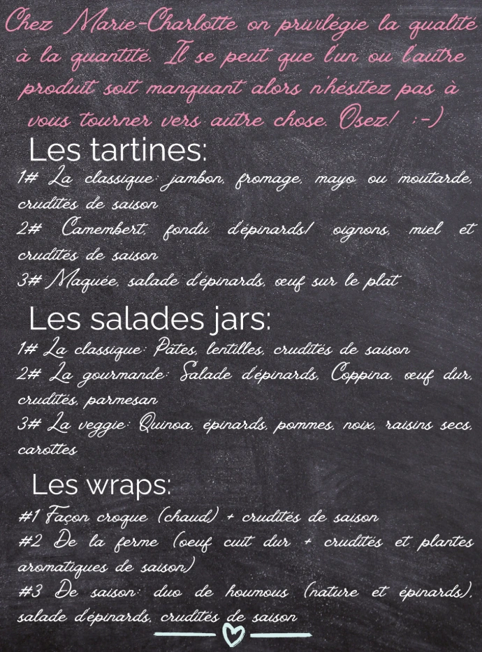 - Une carte salée et une carte sucrée! Le tout avec des produits sélectionnés avec soin par nos producteurs locaux, et beaucoup d'amour!